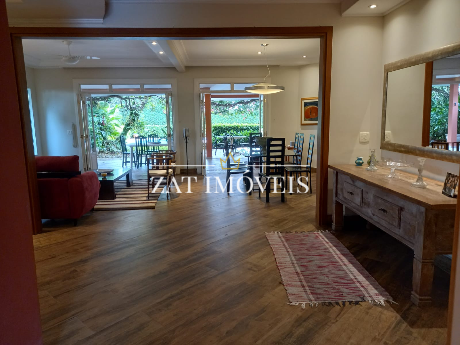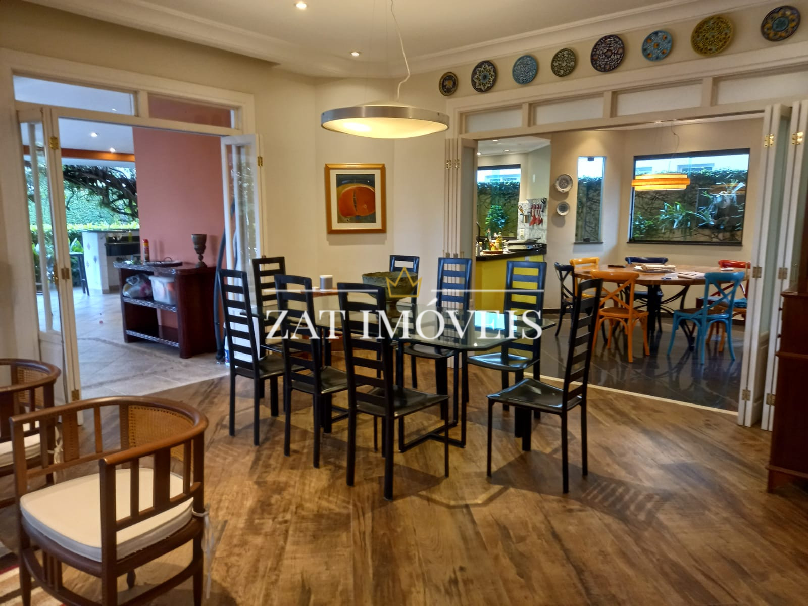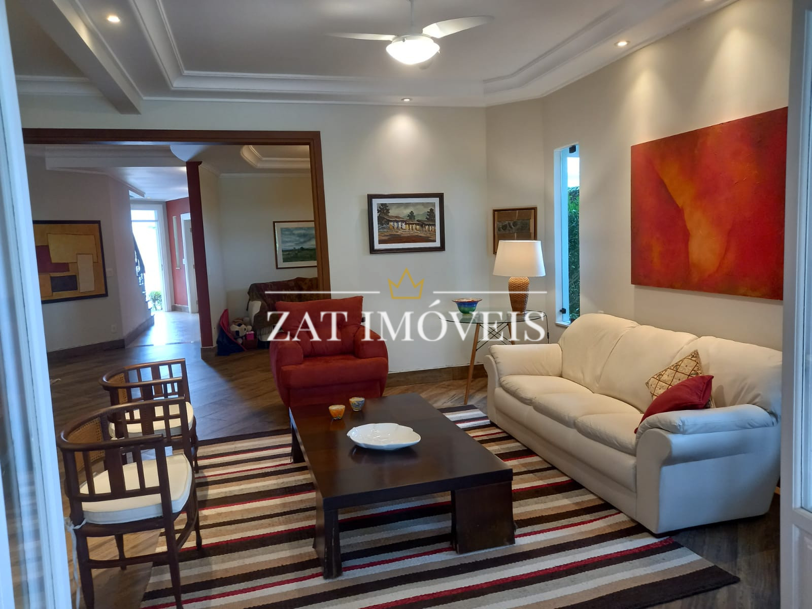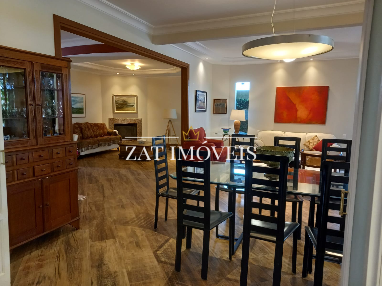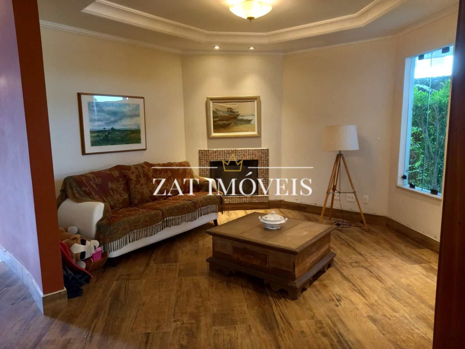 Sala 03 ambientes com lareira e ventilador.