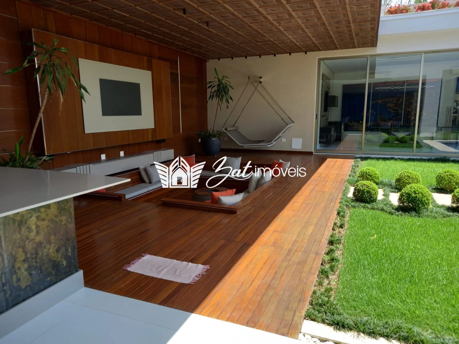 Ainda sob o amplo alpendre, um magnífico lounge com inspiração oriental foi montado para o pleno relaxamento dos moradores. O espaço conta com fogo de chão, estofados em tons neutros e uma charmosa daybed, ideal para quem deseja curtir a arte do dolce far niente.