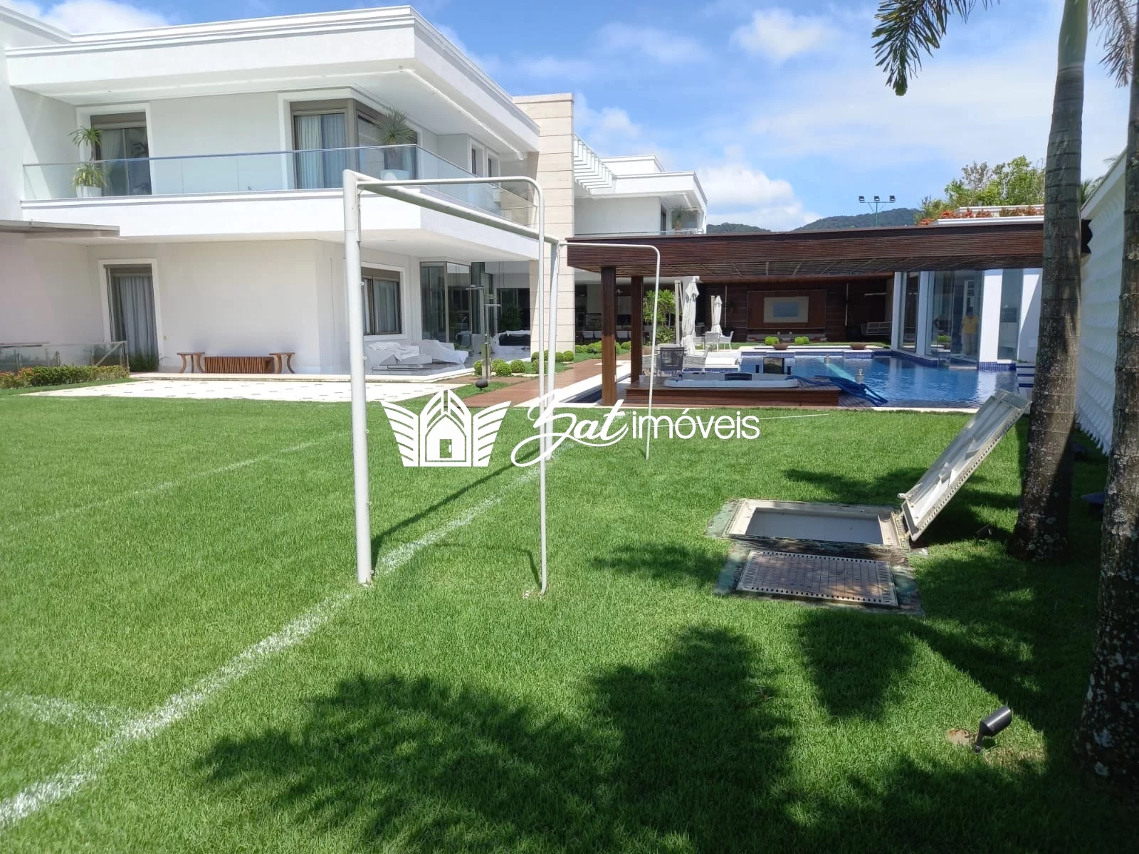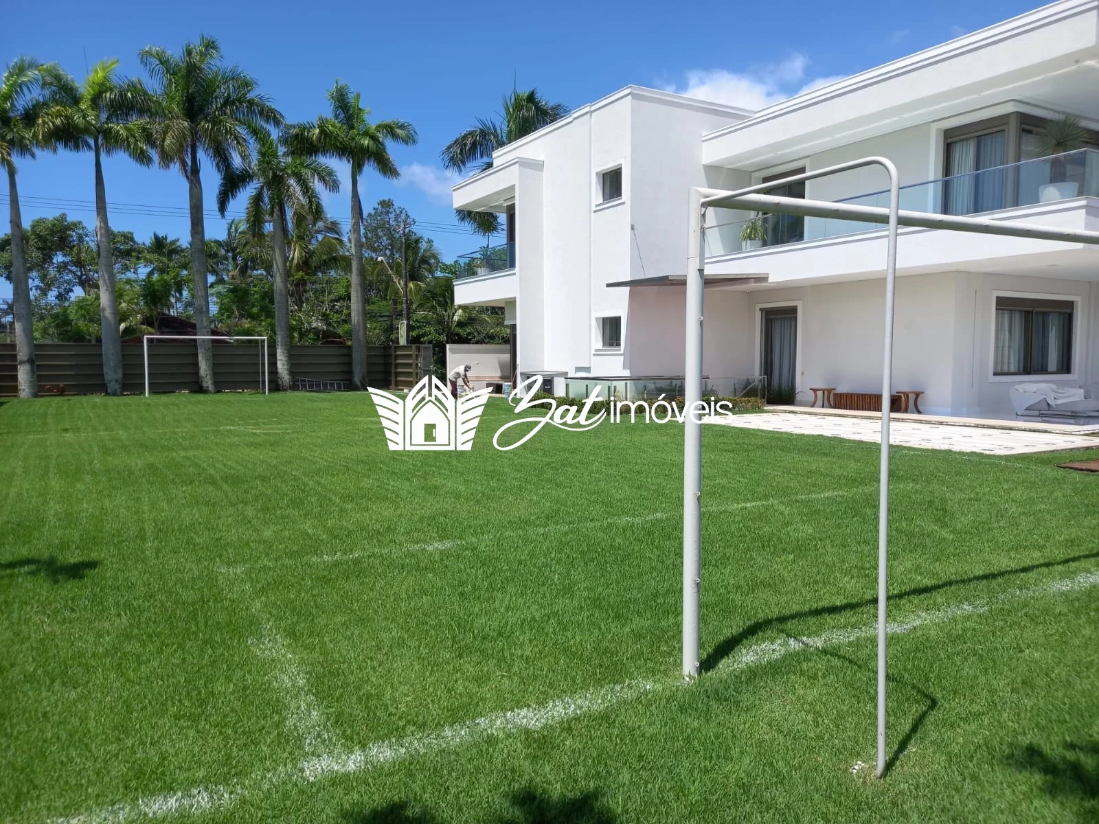 Na lateral do terreno de mais de 2.300 m² há um enorme campo gramado de futebol para a diversão de adultos e crianças.