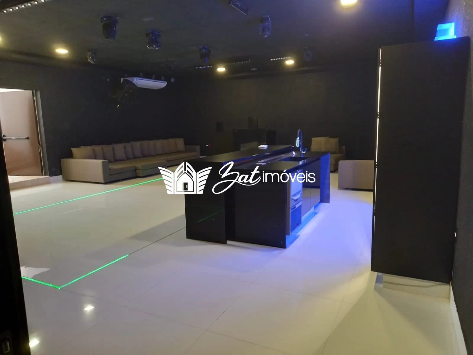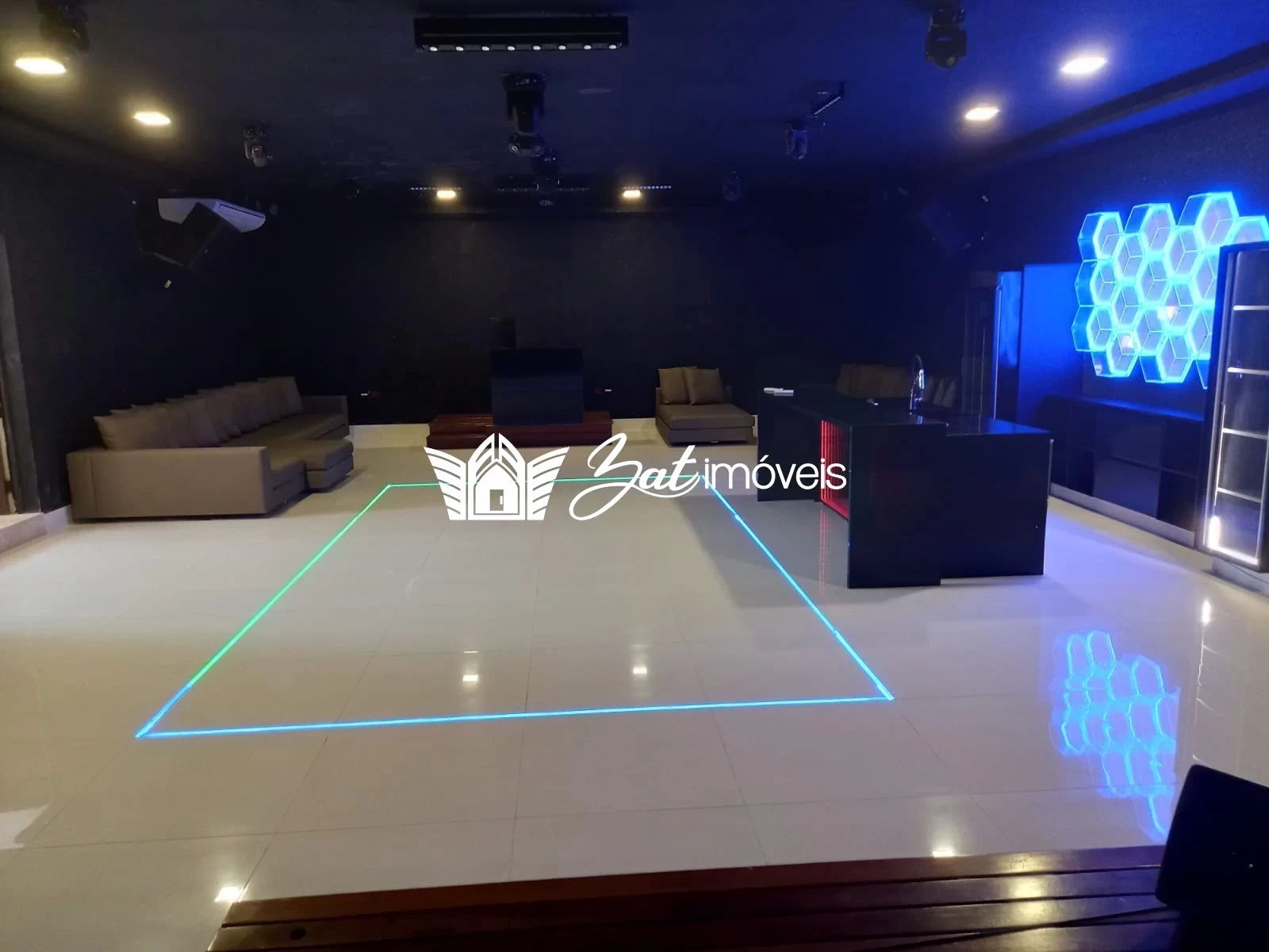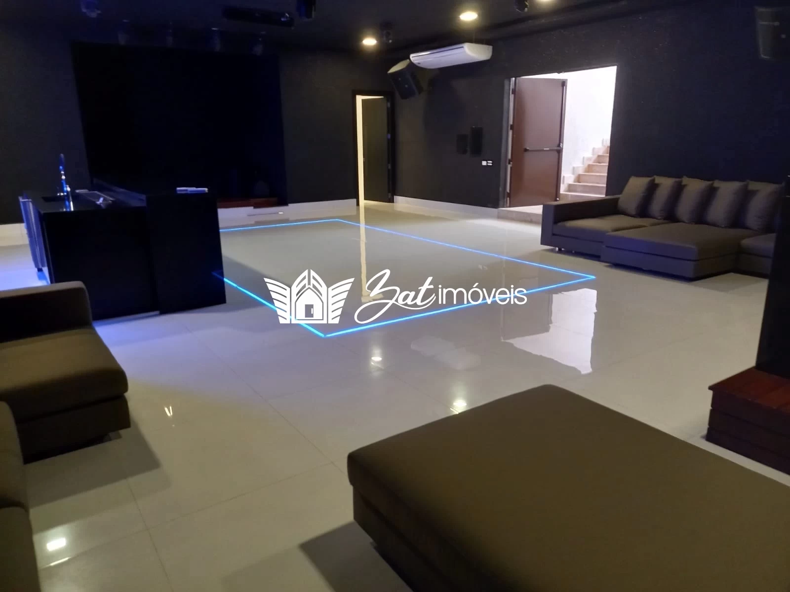 O último detalhe desta residência: ela possui um enorme salão subterrâneo, com sistema de som e iluminação especial, que se transforma em uma balada para até 70 pessoas.