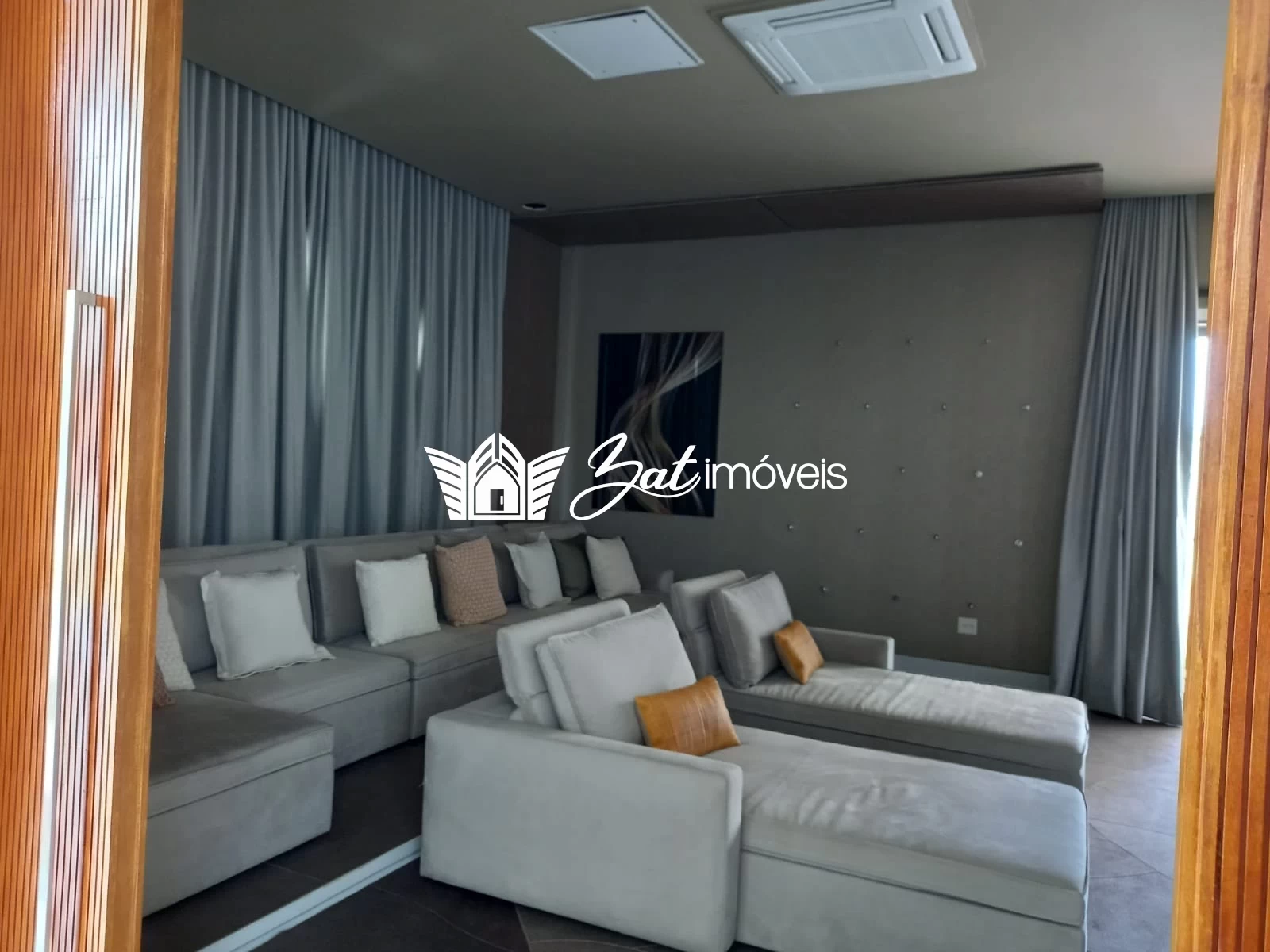 O pé direito duplo foi valorizado pela delicadeza das cortinas em voil e por dois grandes lustres produzidos à mão com cristais Swarovski, especialmente para esta residência.