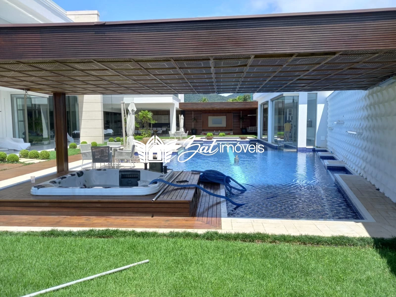 A piscina é um verdadeiro convite para refrescantes mergulhos no verão. Com um desenho único, ela conta com prainha, cascata e raia, para quem deseja se exercitar, além de uma jacuzzi à sombra do pergolado em madeira, que oferece relaxamento e diversão aos proprietários.