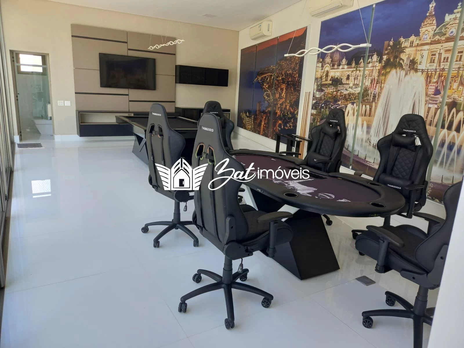 Em um pavilhão separado, a sala de jogos é climatizada e proporciona entretenimento para os adultos, onde partidas de bilhar e poker divertem os moradores e seus convidados madrugada a dentro. No mesmo anexo, a sala de ginástica já está equipada com esteira, módulos para treino de fortalecimento e pesos livres, para quem deseja manter a forma.